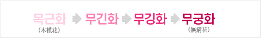 이로써 볼 때, 목근화 → 무긴화 → 무깅화 → 무궁화의 형태로 변했으며 여기에 뜻이 좋은 무궁화로 차음(借音)하여 표기하였음을 알 수 있다.
