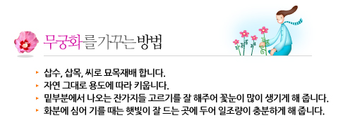 무궁화꽃의 의미 무궁화꽃의 유래 무궁화꽃의 생김새 무궁화꽃의 종류 - 배달계 - 청단심계 - 백단심계 - 아사달계 - 홍단심계 - 외국의 우수품종 무궁화 기르기 무궁화꽃의 풍속과 민속 무궁화꽃의 의학적 효능과 이용 나라꽃무궁화의 잘못된 상식 - 국화 말살 - 진딧물 꽃 - 꽃이 아름답지 않다 무궁화보급을 위해 힘쓰신 분들 - 남궁 억 선생 - 김석겸 무궁화연구원 원장